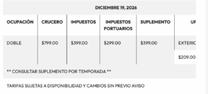 • Impuestos portuarios: 299 USD por persona (Se pagan desde México) para las salidas del 2025 y 2026.